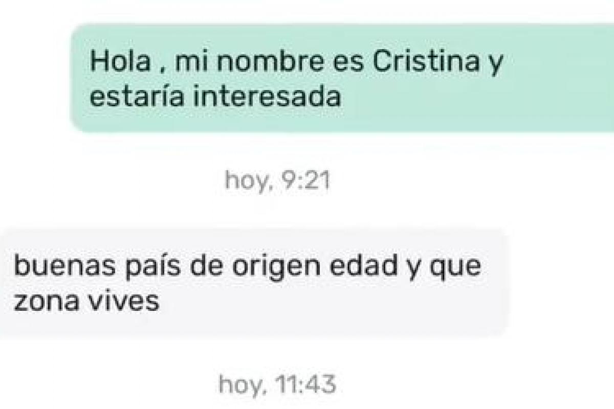 La protagonista de esta historia, quien busca el trabajo, es Cristina, quien escribe a través de una aplicación al supuesto dueño del local. Lo primero que le pregunta a Cristina, tras el saludo, es el país de origen, la edad y por qué zona vive.