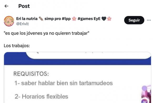 A estos requisitos hay que sumar dos más: hablar "sin tartamudeos" y estar dispuesto a tener "horarios flexibles". Esta oferta se ha viralizado en X (antes Twitter) donde la han visto más de 300.000 personas, muchas de ellas sin dar crédito a lo de las enfermedades.