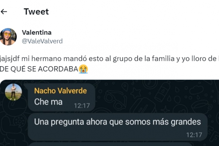 La usuaria de Twitter @ValeValverd ha publicado uno de los tuits más difundidos de las últimas horas al compartir en esa red social la pregunta que le hizo su hermano a su madre en el grupo familiar de WhatsApp.