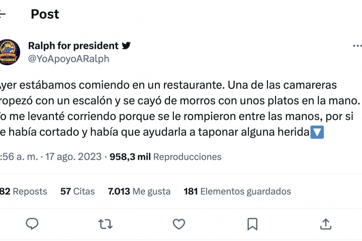En otro tuit ha contado que un compañero de la camarera también le prestó ayuda después de caer: "Perdón, que he quedado yo aquí genial y me he dejado fuera al camarero que dejó de servir para ayudarla y la camarera que barrió todo. Tener buenos compañeros es el todo en estos curros".