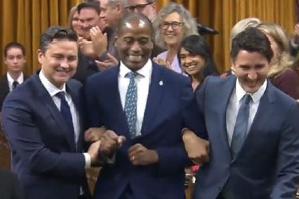 La imagen muestra precisamente eso: Greg Fergus siendo arrastrado de los brazos por Poilievre y Trudeau mientras este se medio resiste entre risas y bajo los aplausos del resto de presentes.