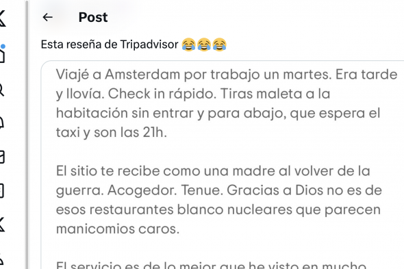 Un usuario ha dejado en Tripadvisor una de esas reseñas que tanto gustan en X, anteriormente Twitter, y que se viralizan en muy poco tiempo. En esta ocasión ha sido por lo bien redactada que está y por una frase final memorable.