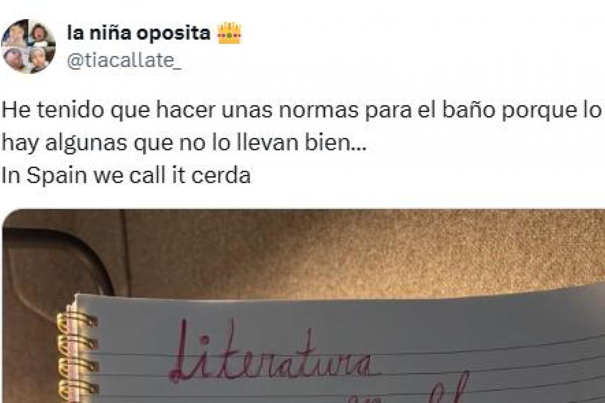 "He tenido que hacer unas normas para el baño porque lo de compartir hay algunas que no lo llevan bien… In Spain we call it cerda", ha manifestado la tuitera, justo antes de adjuntar la imagen donde puede verse el listado de normas que ha elaborado.