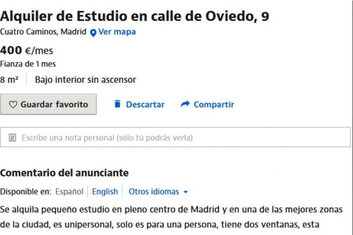 "Se alquila pequeño estudio en pleno centro de Madrid y en una de las mejores zonas de la ciudad. Es unipersonal, solo es para una persona, tiene dos ventanas, está completamente amueblado y todos los muebles y electrodomésticos son a estrenar", dice.