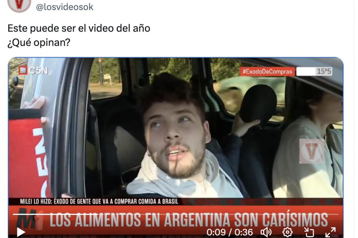 El hombre va de copiloto en un coche que va camino de Brasil donde va a comprar alimentos porque en la Argentina de Milei están muy caros y allí, donde gobierna el socialista Lula Da Silva, son más baratos.