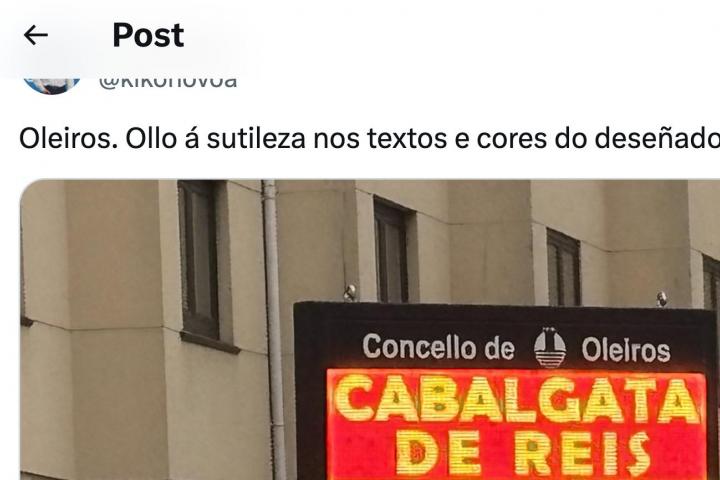 "Oleiros. Ollo á sutileza nos textos e cores do deseñador", ha escrito el periodista Kiko Novoa junto a una foto del cartel lumínico.