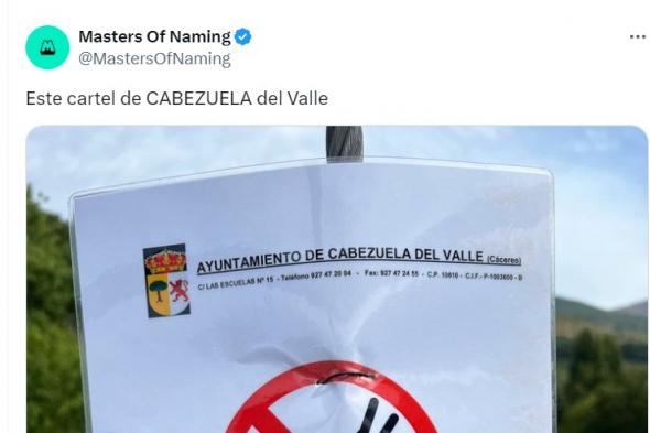 Ha sido la cuenta de X @MastersOfNaming quien ha subido una foto del letrero a la red social junto al mensaje: "Este cartel de CABEZUELA del Valle".