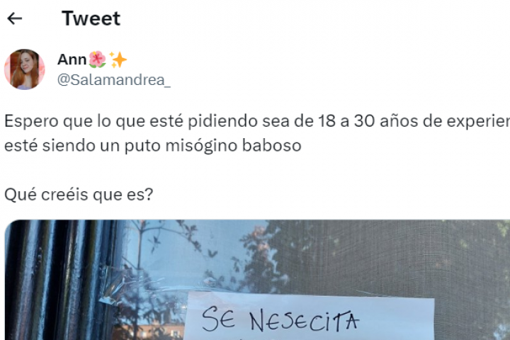 En el letrero en cuestión se lee: "Espero que lo que esté pidiendo sea de 18 a 30 años de experiencia y no esté siendo un puto misógino baboso. ¿Qué creéis que es?".