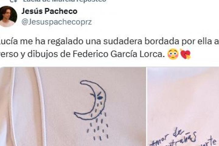 Como respuesta a su ayuda, Lucía le ha diseñado una sudadera bordada por ella a mano en el que se puede leer el verso de Federico García Lorca "amor de mis entrañas, viva muerte" y varios dibujos del poeta como una luna o una flor.