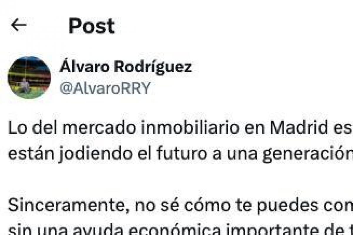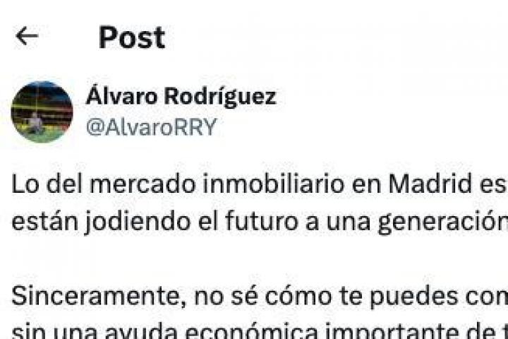 "Al final me tuve que ir de Madrid. Y como yo seguro que muchos otros jóvenes que tienen hasta dos trabajos y a los que sus padres no les pueden dejar el dineral que supone la entrada. Pero 2 años después (junto con mi novia) he podido hipotecarme y empezar nuestro hogar", ha escrito Rodríguez.