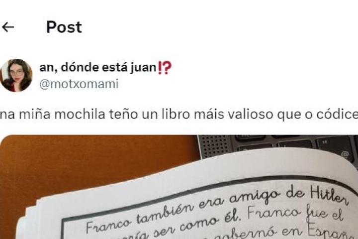 "En mi mochila tengo un libro más valioso que el Códice Calixtino", dice junto a la hoja en la que se puede leer: "Franco también era amigo de Hitler y quería ser como él. Franco fue el dictador fascista que gobernó en España. Era bajito, calvo y con voz de pito, pero muy malo".