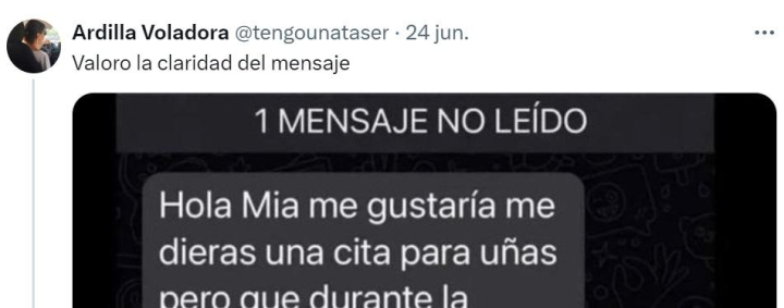 "Hola Mia, me gustaría me dieras una cita para las uñas pero que durante la aplicación no hablaras, ya que me gusta tu trabajo pero no tu forma de ser", ha sido literalmente el texto en cuestión.