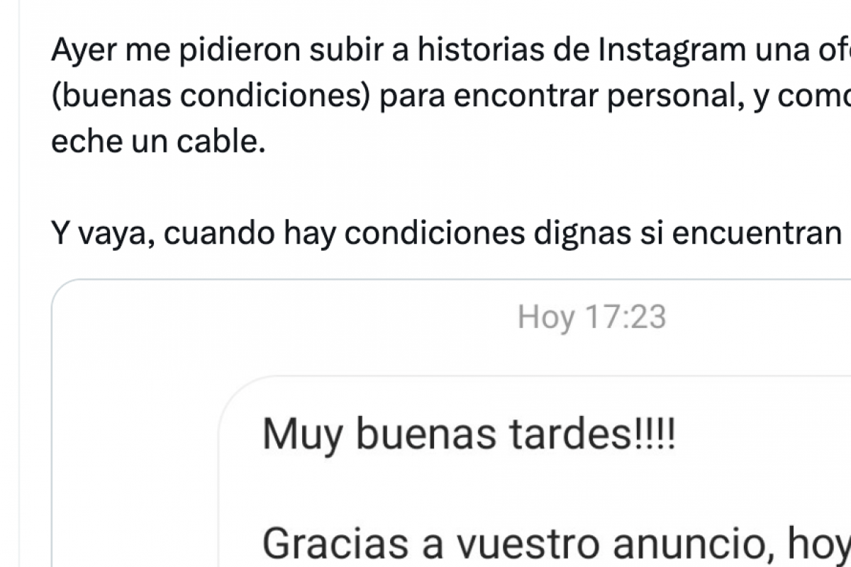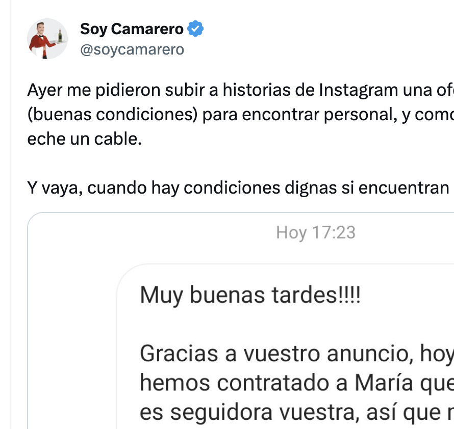 Ahora, ha dejado un claro ejemplo de lo que sucede cuando una oferta de trabajo de camarero en un bar es digna y decente. Ayer me pidieron subir a historias de Instagram una oferta de trabajo (buenas condiciones) para encontrar personal, y como hago a veces, eche un cable. Y vaya, cuando hay condiciones dignas si encuentran personal", ha escrito en Twitter junto con la captura del mensaje.