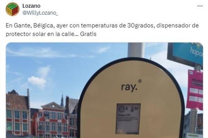 "En Gante, Bélgica, ayer con temperaturas de 30 grados, dispensador de protector solar en la calle... Gratis", ha tuiteado el creador de contenido, justo antes de adjuntar la imagen en la que se puede apreciar el dispensador.