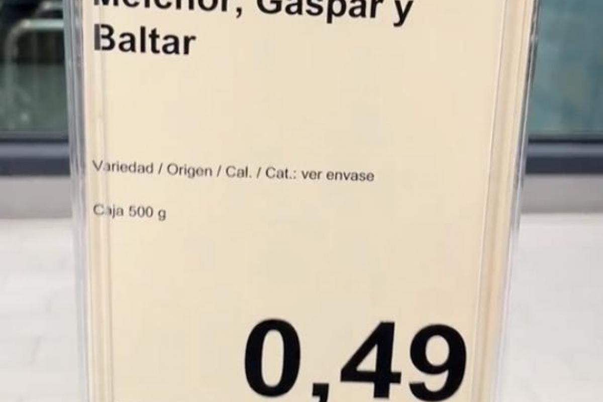 En un cartel se puede leer "Melchor, Gaspar y Baltar (sic)" y justo debajo que la cosa en cuestión vale 0,49 euros.