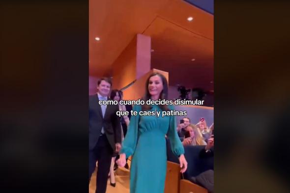 Y en la escena, que dura apenas 15 segundos, se ve cómo Letizia entra a un auditorio en cuyo acceso hay una rampa de parqué. Como lleva tacones, la reina opta por patinar, literalmente, sobre el suelo para minimizar el riesgo de caída.