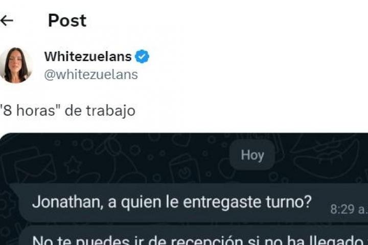 En los mensajes, publicados por la usuaria @whitezuelans, se puede ver cómo el superior escribe al trabajador: "Jonathan, ¿a quién le entregaste el turno? No te puedes ir de recepción si no ha llegado tu relevo. No puede volver a pasar JAMÁS".