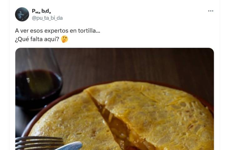 "A ver esos expertos en tortilla... ¿Qué falta aquí?", ha preguntado junto a la instantánea. Y ha provocado que, en las respuestas, haya dos opiniones: quienes están a favor de comer la tortilla así y quienes se manifiestan en contra.