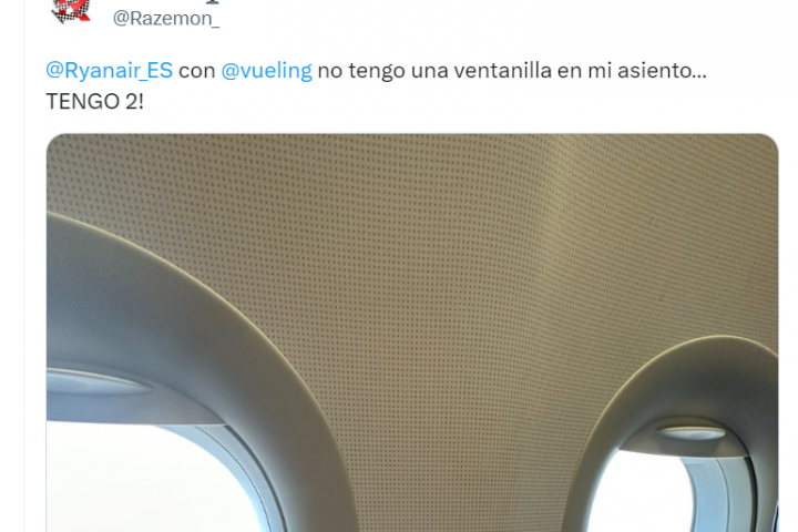 Ryanair ha vuelto a dar otra muestra más de ese estilo con la respuesta que le ha dado a un usuario que les hizo una crítica. "@Ryanair_ES con @vueling no tengo una ventanilla en mi asiento… TENGO 2!", les escribió junto a una foto en la que se mostraba lo que decía.