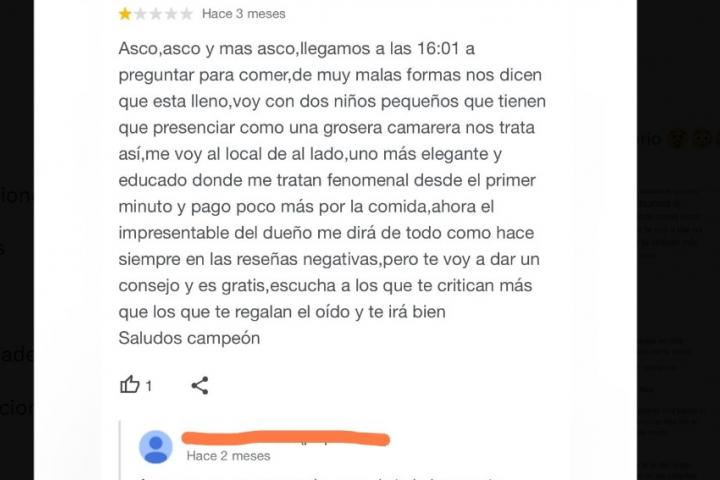 "Ahora el impresentable del dueño me dirá de todo como hace siempre en las reseñas negativas pero te voy a dar un consejo, y es gratis: escucha a los que te critican más que a los que te halagan el oído. Saludos, campeón", escribió el cliente.