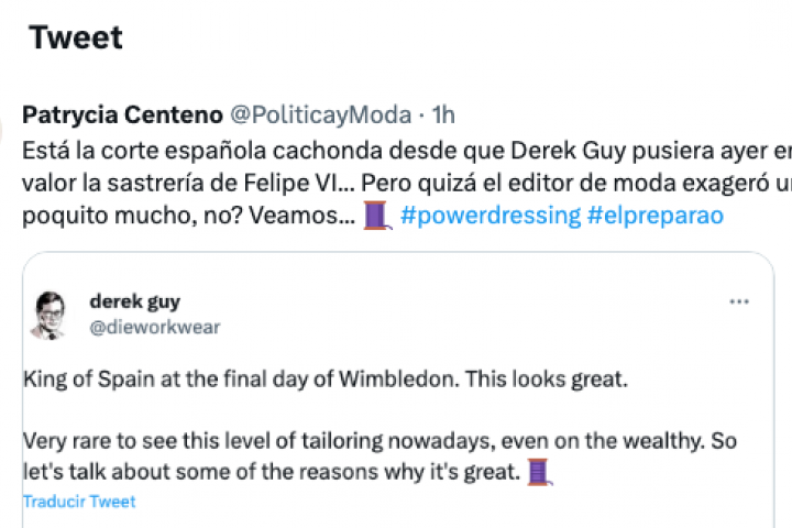Y ha añadido: "Derek Guy se fija en Felipe VI en Wimbledon y dice que 'el nivel de su sastrería no es habitual entre los ricos'. Espero que no, porque esa arruga que le hace la americana a la altura del botón es un horror/error si te gasta una pasta en un traje a medida".