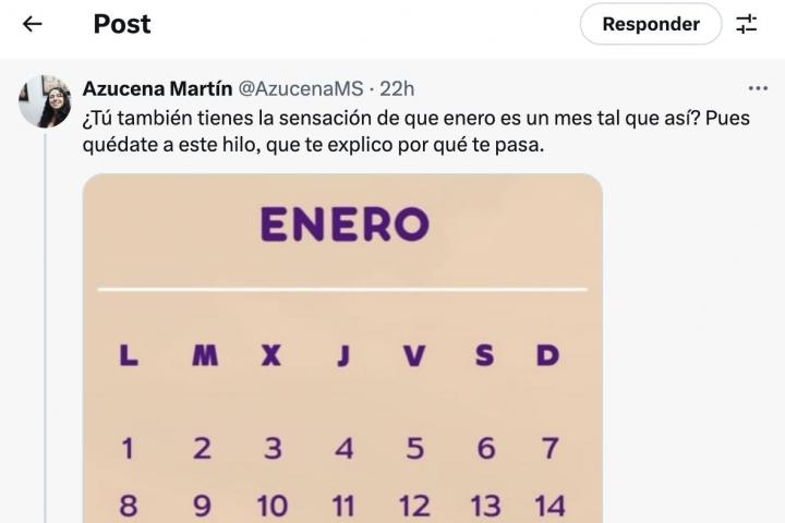 Que enero se hace largo es una expresión que se escucha a diario en casi cualquier ámbito de la vida. La biotecnóloga Azucena Martín ha explicado en un extenso hilo en X (antes Twitter) —que han visto más de dos millones de personas— por qué parece que el primer mes del año es más largo que el resto.