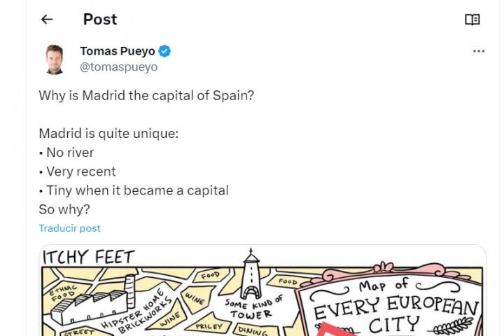 Tomás Pueyo, ingeniero español que trabaja en Silicon Valley, ha publicado unos de los mensajes más compartidos de las últimas horas al explicar a los extranjeros las razones por las que Madrid es la capital de España a pesar de que este caso supone una anomalía en Europa.