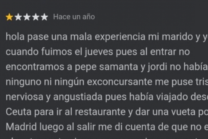 La usuaria escribió: "Hola, pasé una mala experiencia. Mi marido y yo cuando fuimos el jueves. Pues al entrar no encontramos a Pepe, Samanta y Jordi. No había ninguno ni ningún exconcursante. Me puse triste y nerviosa y angustiada pues había viajado desde Ceuta para ir al restaurante y dar una vuelta por Madrid".