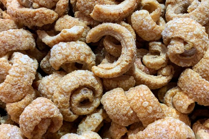 Su amiga describe el producto como "una raba frita con forma de corazón" y justo después cada una coge un torrezno para probarlo. Aunque podría parecer que por la descripción de "esperado" les habría gustado el producto, la realidad es que no.