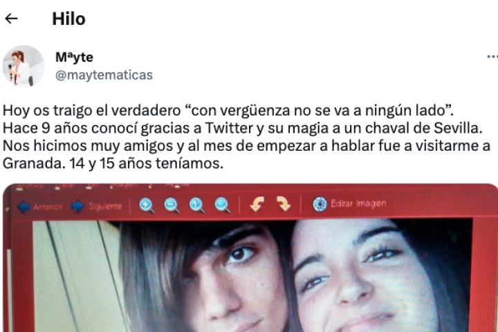 La tuitera cuenta todo para tratar de demostrar que "con vergüenza no se va a ningún lado" y relata que hace nueve años conoció, gracias a Twitter, a un joven de Sevilla del que se hizo muy amiga: "Al mes de empezar a hablar fue a visitarme a Granada. 14 y 15 años teníamos".