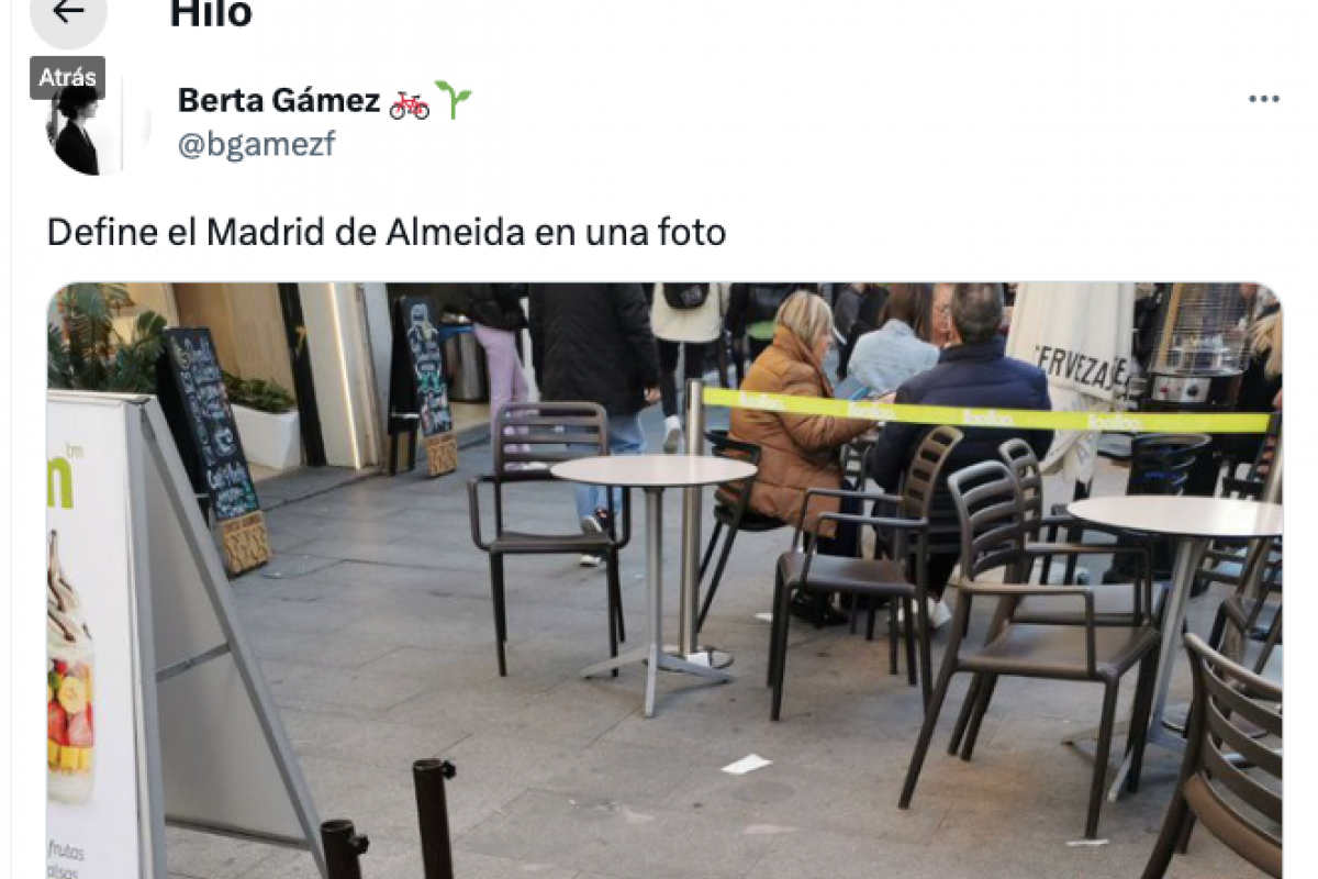 "Define el Madrid de Almeida en una foto", ha escrito la usuaria en el tuit, que en tres días supera los 2.300 retuits y los 8.200 'me gusta'.
