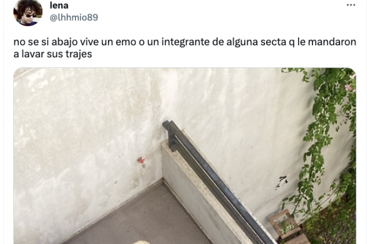 "No sé si abajo vive un emo o un integrante de alguna secta q le mandaron a lavar sus trajes", ha escrito junto a una foto de la terraza el piso inferior, en el que se ven colgadas de un tendedero multitud de prendas de vestir de color negro.