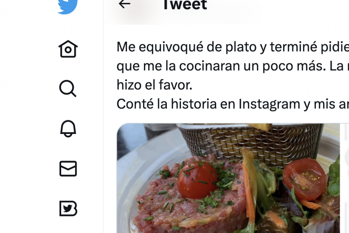 En Twitter también hay miles de comentarios de todo tipo. En uno de ellos ha contado que le dio impresión ver la carne así de cruda. En otro, a una pregunta sobre si la echaron del restaurante, ha dicho que no pero que no le preguntaron qué tal había comido ni si quería algo más.