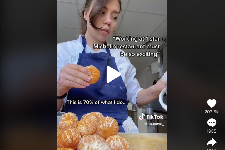 "Trabajar en un restaurante con una estrella Michelín puede ser muy excitante", ha comentado en un vídeo de unos 20 segundos donde se puede ver cómo le quita a unas mandarinas lo blanco para dejarlas lo más lisas posibles.