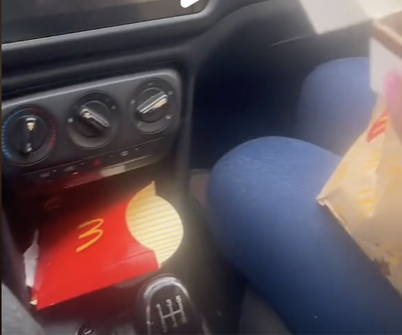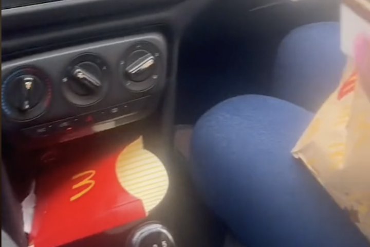 La pareja se ha grabado comiendo dentro del coche unas hamburguesas del McDonalds y el título que encabeza el vídeo dice: "Mi esposa comiendo antes de ir a buscar a los niños al colegio porque en casa hay fideos".