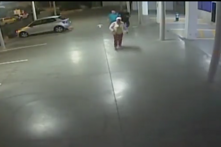 Las imágenes están grabadas en un aparcamiento y en ellas aparecen una pareja. El malhechor se acerca al hombre y, efectivamente, le introduce la pierna entre las de él, de forma que está a punto de caer.