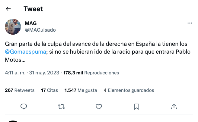 Ahora, en medio de las polémicas que rodean a El Hormiguero, el usuario de Twitter @MAGuisado ha escrito: "Gran parte de la culpa del avance de la derecha en España la tienen los @Gomaespuma; si no se hubieran ido de la radio para que entrara Pablo Motos...".