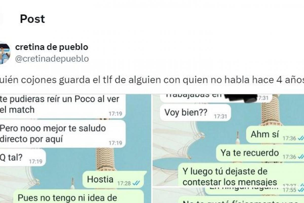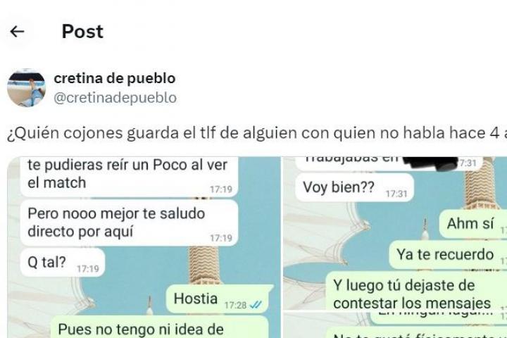 La usuaria de X @cretinadepueblo ha publicado uno de los mensajes más difundidos de los últimos días tras compartir la conversación de WhatsApp que ha tenido con una persona con la que quedó hace cuatro años y que le dejó de contestar en aquella época.