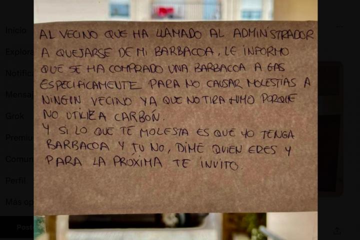 El intercambio de notas que se han dejado dos vecinos por culpa de las barbacoas que organiza uno de ellos está dando mucho juego en la red social X, donde lo ha publicado la cuenta @LiosdeVecinos, especializada precisamente en estas peleas vecinales.