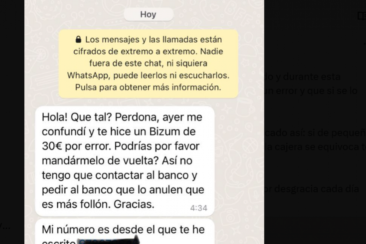 "Anoche recibí un Bizum de 30€ de un desconocido y durante esta madrugada me escribió diciendo que había sido un error y que si se lo podía devolver", explica.
