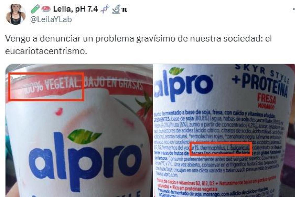 La científica Leila (@LeilaYLab) ha subido a su cuenta de la red social X, anteriormente conocida como X, un tuit de broma en el que critica que el yogurt vegetal Alpro no es 100% vegetal porque lleva bacterias.