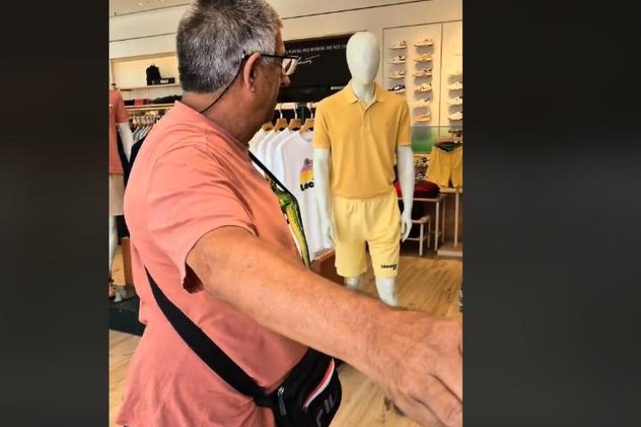 "Vamos a entrar la camiseta de Lacoste porque este cocodrilo viene muy vivo", dice el hombre a cámara, mientras se encontraba en los exteriores de una tienda de la marca francesa de ropa o relojes.