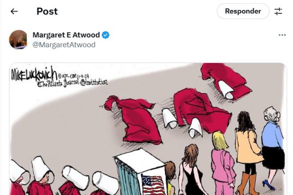En el dibujo se veía cómo varias mujeres entraban en un biombo de votación con los trajes típicos que se veían en la serie de televisión basada en el libro de la escritora. Esa obra se desarrolla en un futuro distópico en manos de un gobierno totalitario, una sociedad organizada con un jerárquico fanatismo religioso y en la que las mujeres son subyugadas.