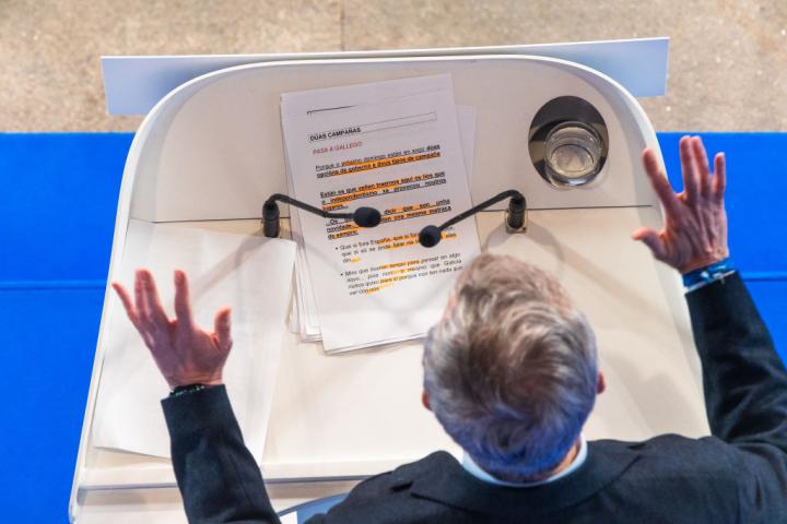 Lo que ha llamado la atención es que arriba, en mayúsculas y color rojo, pone: "Pasa a gallego". Y, a partir, de ahí todo el discurso se pronuncia en ese otro idioma.