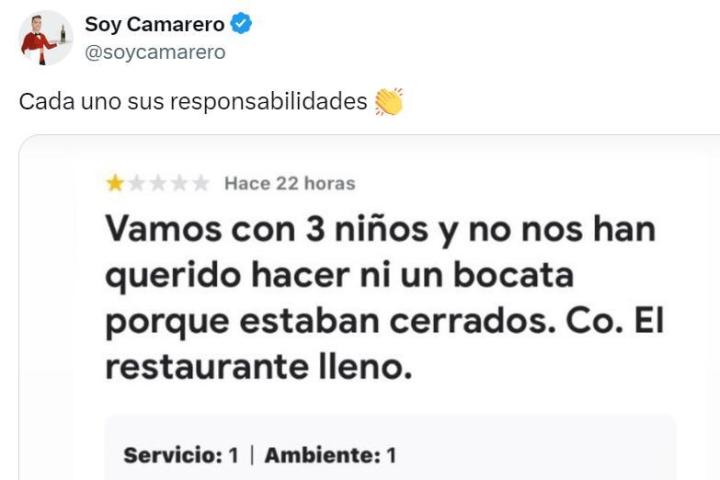 Desde la cuenta de Soy Camarero, en la que se difunden anécdotas, situaciones o polémicas relacionadas con el sector de la hostelería, se ha compartido la respuesta que dio el dueño de un restaurante a un cliente que le criticó en las opiniones de Google por no darle de comer.