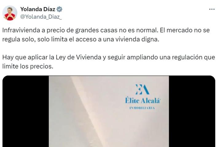 La ministra de Trabajo y Economía Social, Yolanda Díaz, ha publicado en su cuenta de X (@Yolanda_Diaz_) un tuit citando un vídeo viral de una inmobiliaria que vende por 199.000 euros un piso de tan solo 27 metros cuadrados en el centro de Madrid.
