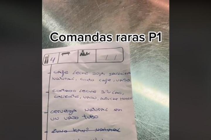 El usuario de TikTok @whiskeii ha subido a esa red social un vídeo en el que muestra las sorprendentes peticiones que le hizo un grupo de clientes. "Un café con leche con leche se soja, con sacarina, leche natural, corto de café en vaso", empieza diciendo, a la vez que matiza que este "tiene un pase" porque es un tipo que le han pedido "bastantes veces".