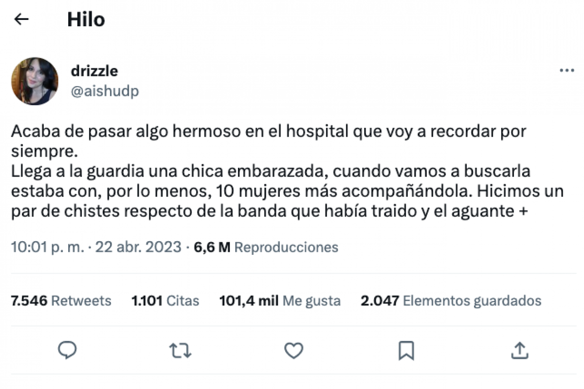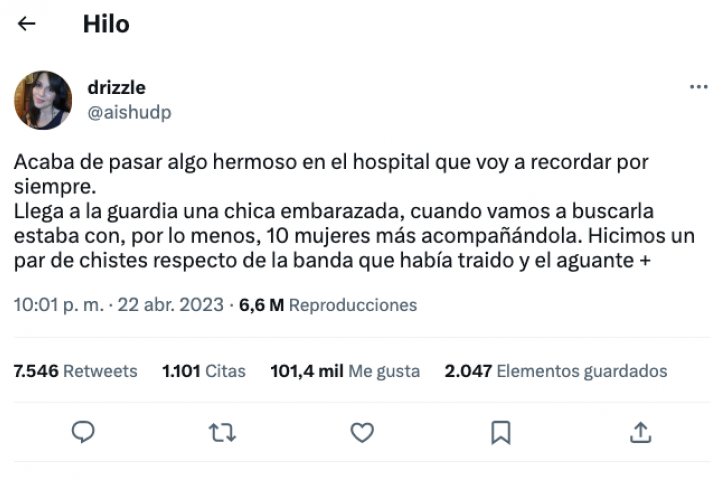 "Acaba de pasar algo hermoso en el hospital que voy a recordar por siempre. Llega a la guardia una chica embarazada, cuando vamos a buscarla estaba con, por lo menos, 10 mujeres más acompañándola. Hicimos un par de chistes respecto de la banda que había traído y el aguante", escribe.