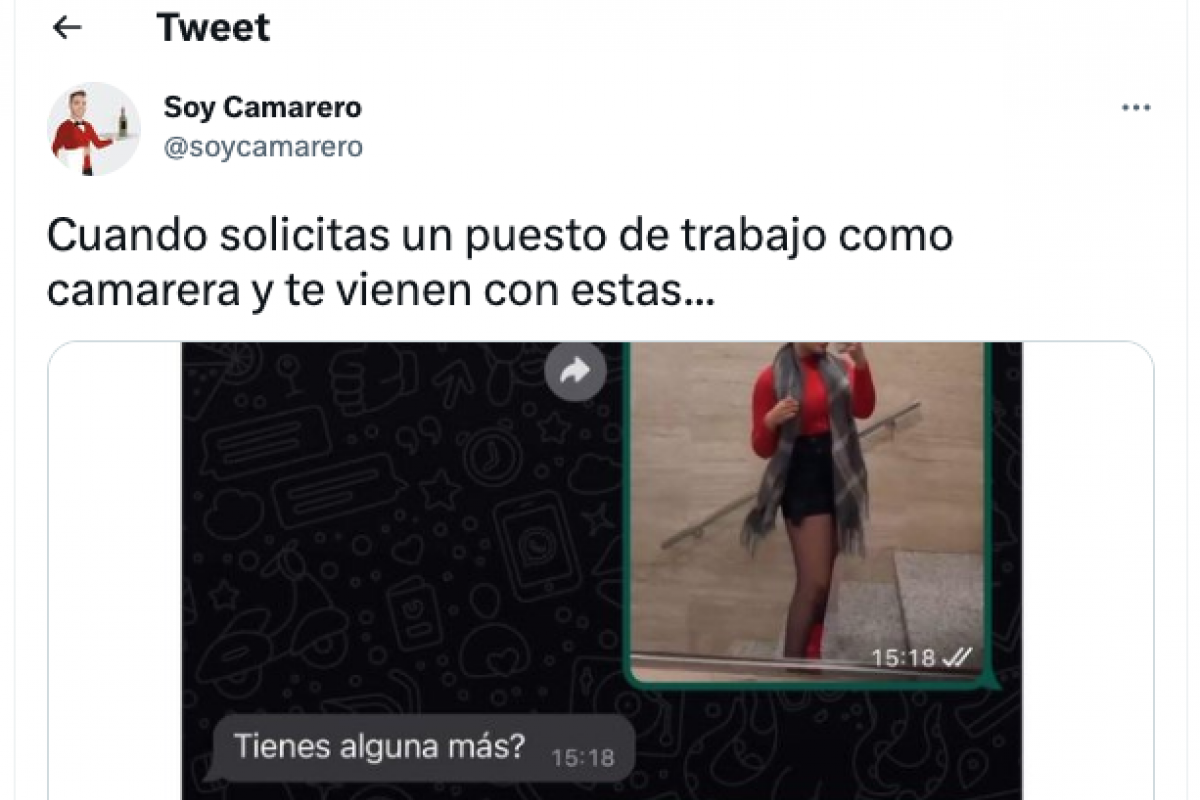 La popular cuenta de Twitter @soycamarero, especializada en dejar en evidencia las malas condiciones de los trabajadores de la hostelería, ha provocado la indignación generalizada en Twitter al compartir la conversación de WhatsApp entre un hostelero y una aspirante a camarera.