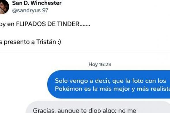 "Hoy en FLIPADOS DE TINDER....... Os presento a Tristán :)", ha escrito la joven usuaria, adjuntando la imagen con la conversación. En la instantánea se puede ver como ella le dejaba este primer mensaje: "Solo vengo a decir que la foto con los Pokémon es la más mejor y más realista".